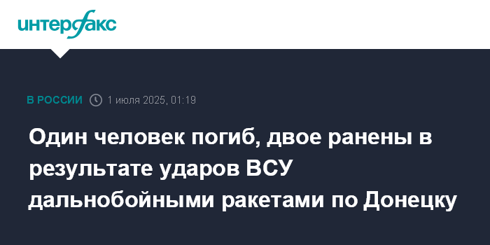 Москва. 1 июля. INTERFAX.RU - Глава ДНР Денис Пушилин сообщил, что в результате ударов ВСУ по Донецку дальнобойными ракетами в понедельник вечером погибла женщина, еще два человека ранены.