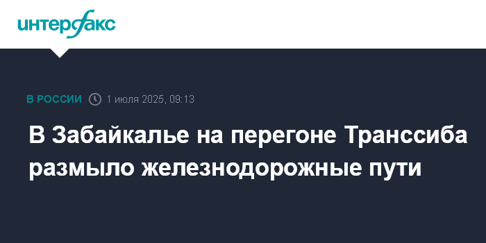 "По предварительным данным, 1 июля 2025 года на перегоне станций Карымская - Дарасун из-за погодных условий произошел размыв насыпи железнодорожных путей", - говорится в сообщении.
