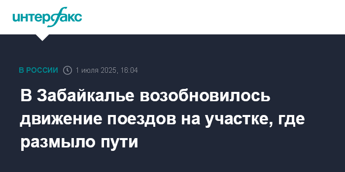 "1 июля 2025 года в 18:47 (время местное) на станции Дарасун Забайкальской железной дороги полностью завершены восстановительные работы на месте размыва пути. В настоящее время движение поездов на станции осуществляется в штатном режиме", - говорится в сообщении.
