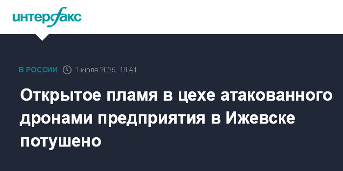 Москва. 1 июля. INTERFAX.RU - Пожарные подразделения ликвидировали открытое горение в цехе предприятия в Ижевске, возникшее после атаки БПЛА, сообщил глава Удмуртии Александр Бречалов.