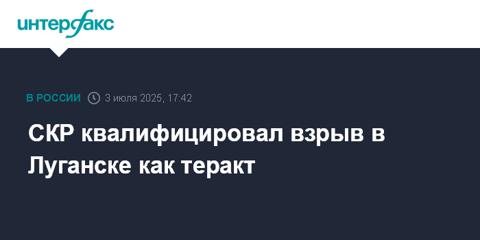 Москва. 3 июля. INTERFAX.RU - По факту взрыва в Луганске, в результате которого погиб бывший мэр города Манолис Пилава, возбуждено уголовное дело о теракте и незаконном обороте взрывчатки, сообщает телеграм-канал СКР.