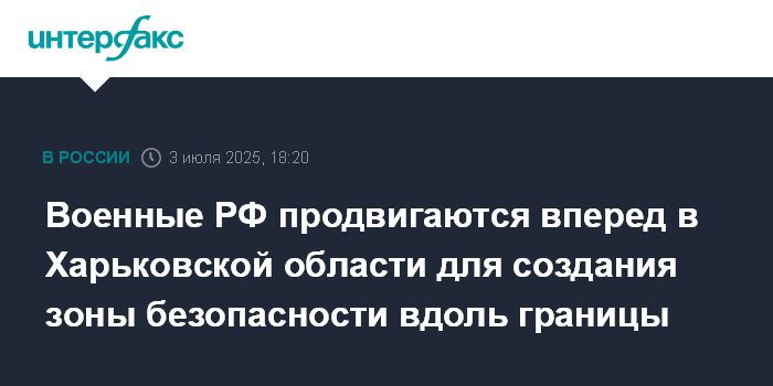 Москва. 3 июля. INTERFAX.RU - Российские военнослужащие движутся вперёд по Харьковской области для создания зоны безопасности вдоль госграницы РФ, заявляет Минобороны России.