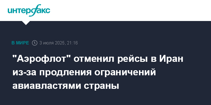 Москва. 3 июля. INTERFAX.RU - "Аэрофлот" отменил регулярные рейсы из Москвы в Тегеран в связи с продлением ограничений на полеты авиационных властей Ирана.