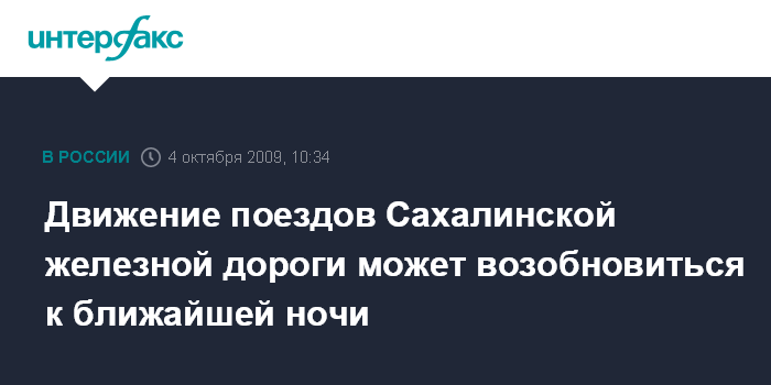Москва. 4 октября. INTERFAX.RU - На аварийном участке Сахалинской железной дороги продолжаются восстановительные работы. Как сообщил агентству "Интерфакс - Дальний Восток" пресс-секретарь СахЖД Сергей Дащинский, движение пассажирских поездов удастся восстановить, скорее всего, к ночи.