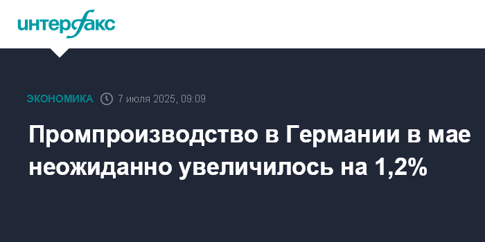 Москва. 7 июля. INTERFAX.RU - Объем промышленного производства в ФРГ в мае увеличился на 1,2% по сравнению с предыдущим месяцем, сообщило статистическое управление страны.