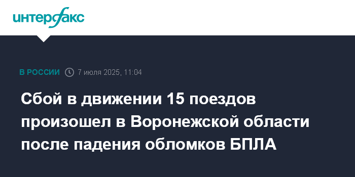 Москва. 7 июля. INTERFAX.RU - Полтора десятка пассажирских поездов были задержаны в пути из-за повреждения контактной сети обломками сбитых беспилотников на перегоне Журавка - Митрофановка в Воронежской области, сообщила Юго-Восточная железная дорога (ЮВЖД, филиал ОАО "РЖД") в понедельник.
