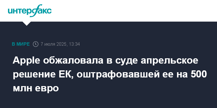 Москва. 7 июля. INTERFAX.RU - Apple Inc. обжаловала в европейском суде решение Еврокомиссии (ЕК), оштрафовавшей компанию в апреле этого года на 500 млн евро за нарушение требований закона о цифровых рынках - Digital Markets Act (DMA).