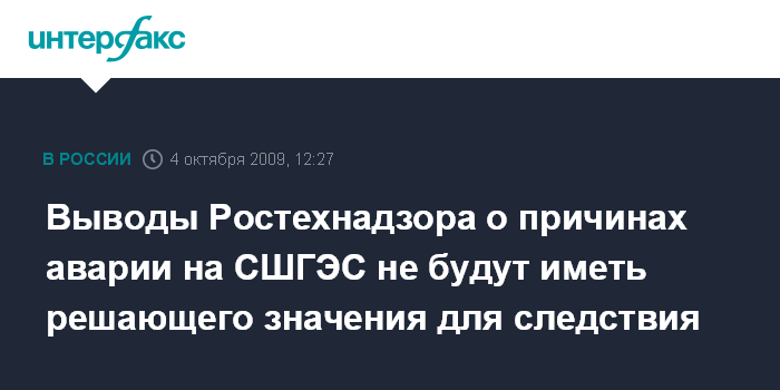 Москва. 4 октября. INTERFAX.RU - Выводы Ростехнадзора о причинах и виновниках аварии на Саяно-Шушенской ГЭС не будут иметь решающего значения для следствия, проводимого по факту этой крупнейшей техногенной катастрофы.
