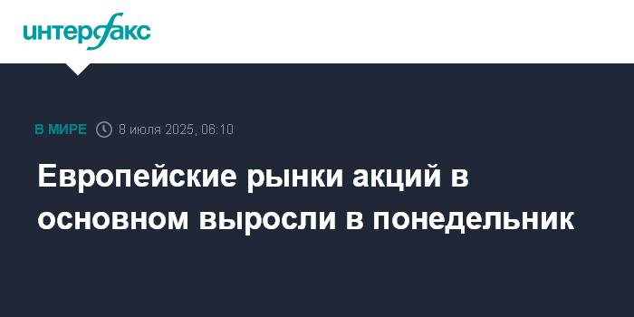 Москва. 8 июля. INTERFAX.RU - Фондовые индексы крупнейших стран Западной Европы в основном выросли по итогам торгов в понедельник, инвесторы оценивали статданные и продолжали следить за развитием ситуации в международной торговле.
