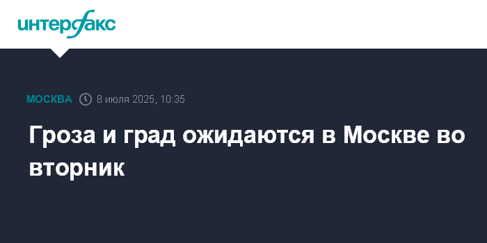 Москва. 8 июля. INTERFAX.RU - Столичный комплекс городского хозяйства предупредил, что во вторник в Москве возможны дождь, гроза с порывистым ветром и ливень с градом.