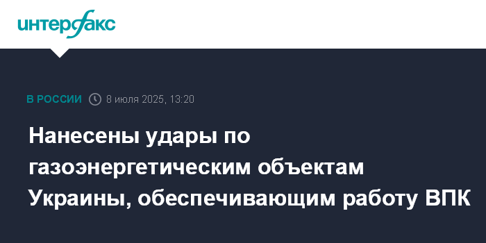 Москва. 8 июля. INTERFAX.RU - Российские военные в течение суток нанесли поражение объектам газоэнергетической инфраструктуры, обеспечивающим работу военно-промышленного комплекса (ВПК) Украины, сообщили в Минобороны РФ во вторник.
