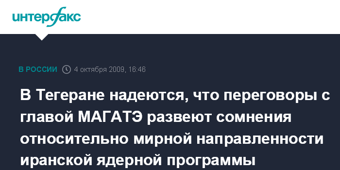 Москва. 4 октября. INTERFAX.RU - Глава Иранской организации по атомной энергии Али Акбар Салехи выразил надежду, что его встреча с главой Международного агентства по атомной энергии (МАГАТЭ) Мохаммедом аль-Барадеем поможет навсегда развеять сомнения относительно мирной направленности ядерной программы Ирана, сообщает иранский телеканал "Пресс-ТВ".