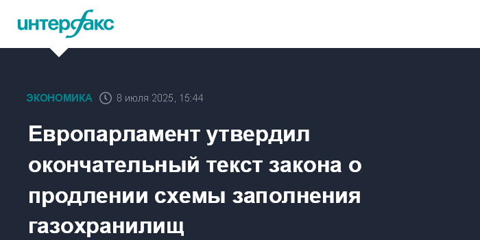 Москва. 8 июля. INTERFAX.RU - Европарламент принял закон, продлевающий схему заполнения газохранилищ в ЕС до конца 2027 года при большей гибкости правил с целью снижения цен.