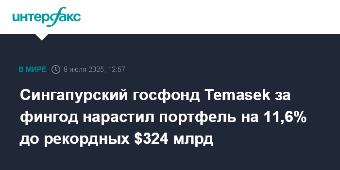 Москва. 9 июля. INTERFAX.RU - Чистая стоимость портфеля сингапурского государственного инвестиционного фонда Temasek Holdings Pte. в прошлом финансовом году, который завершился 31 марта, выросла на 11,6%.
