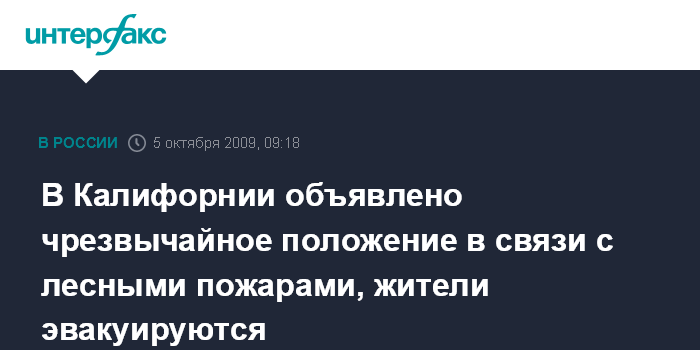 Москва. 5 октября. INTERFAX.RU - Губернатор американского штата Калифорния Арнольд Шварценеггер объявил о введении режима чрезвычайного положения в округе Сан-Бернардино в связи с быстрым распространением лесных пожаров, сообщает телекомпания Си-Эн-Эн.
