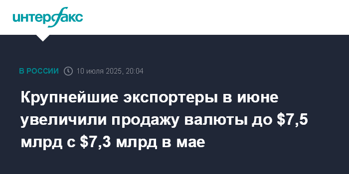 Москва. 10 июля. INTERFAX.RU - Крупнейшие экспортеры в июне 2025 года увеличили продажу валюты на 3% - до $7,5 млрд с $7,3 млрд в мае - при сокращении среднедневных чистых продаж на 2% м/м, до $397 млн, говорится в докладе Банка России "Обзор рисков финансовых рынков".