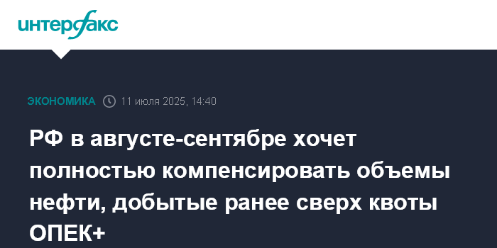 РФ в августе-сентябре хочет полностью компенсировать объемы нефти, добытые ранее сверх квоты ОПЕК+