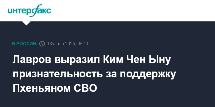 Москва. 13 июля. INTERFAX.RU - Глава МИД России Сергей Лавров во время встречи с председателем Государственных дел КНДР Ким Чен Ыном выразил искреннюю признательность Пхеньяну за поддержку СВО на Украине.