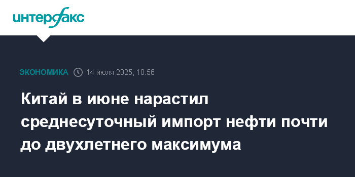 Москва. 14 июля. INTERFAX.RU - В июне среднесуточный импорт нефти Китаем составил 12,14 млн б/с, что стало максимальным уровнем за последние почти два года, свидетельствуют расчеты "Интерфакса" на основе данных Главного таможенного управления КНР.
