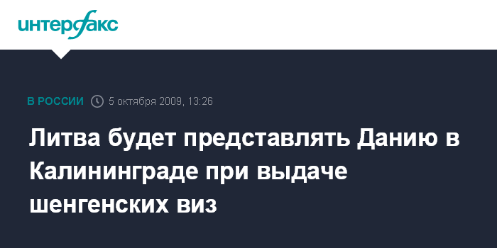 Москва. 5 октября. INTERFAX.RU - Литва и Дания подписали соглашение, которым Литва обязуется представлять Данию в Калининграде в вопросах выдача шенгенских виз. Соответствующую ответную ному глава МИД Литвы Вигаудас Ушацкас (Vygaudas Usackas) в понедельник вручил послу Дании в Литве Лауридсу Микаэльсену, сообщило литовское внешнеполитическое ведомство. Согласно этому договору российским гражданам, следующим в Данию, будут выдаваться шенгенские визы в генеральном консульстве Литвы в Калининграде.