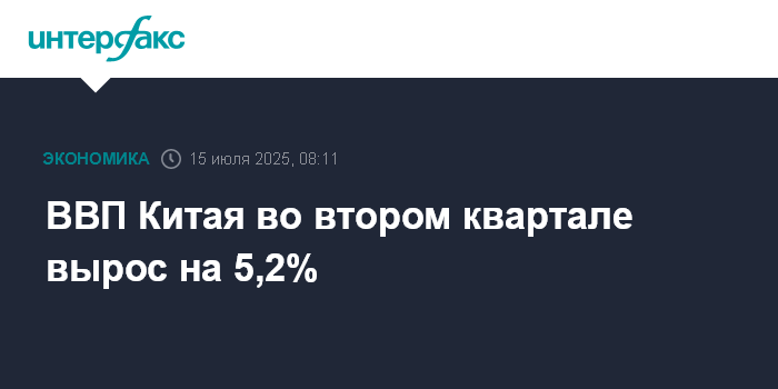 Москва. 15 июля. INTERFAX.RU - Экономика Китая во втором квартале 2025 года выросла на 5,2% в годовом выражении, сообщило Государственное статистическое управление КНР.