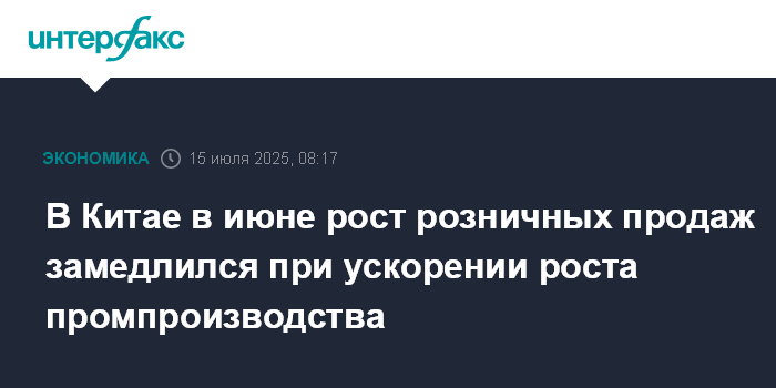 Розничные продажи в КНР в июне повысились на 4,8% в годовом выражении (в мае - на 6,4%). Эксперты ожидали ослабления роста до 5,6%.