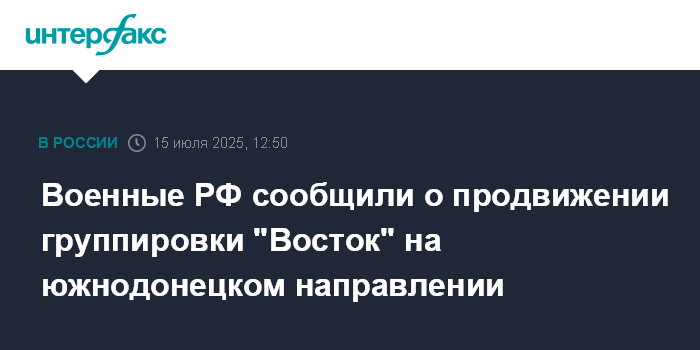 Москва. 15 июля. INTERFAX.RU - Группировка войск "Восток" улучшает позиции, продвигается на южнодонецком направлении, заявили в Минобороны РФ во вторник.