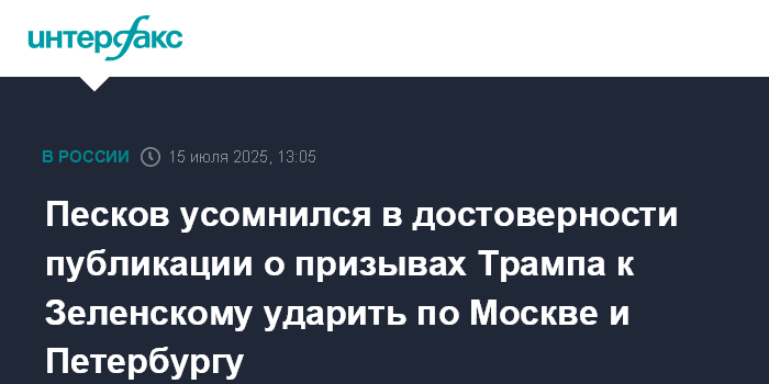 Ранее издание The Washington Post со ссылкой на источники сообщило, что президент США Дональд Трамп на прошлой неделе спросил президента Украины Владимира Зеленского, почему ВСУ не ударил по Москве. Согласно данным издания, президент США также сказал о необходимости усилить давление не только на Москву, но и на Санкт-Петербург.