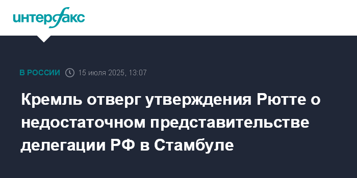 Москва. 15 июля. INTERFAX.RU - Пресс-секретарь президента РФ Дмитрий Песков отверг утверждения генерального секретаря НАТО Марка Рютте о недостаточном уровне представительства российской делегации в Стамбуле на переговорах с украинской стороной.