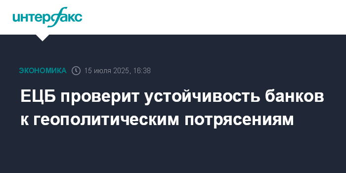 Москва. 15 июля. INTERFAX.RU - Европейский центральный банк (ЕЦБ) проверит устойчивость банков к геополитическим рискам, предложив им самостоятельно разработать сценарии, при которых они могут лишиться значительной части своего капитала.