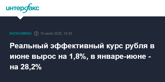 Москва. 15 июля. INTERFAX.RU - Реальный эффективный курс рубля к корзине валют государств - основных торговых партнеров России в июне 2025 года вырос на 1,8% по отношению к маю, согласно предварительной оценке ЦБ РФ, опубликованной на его сайте.