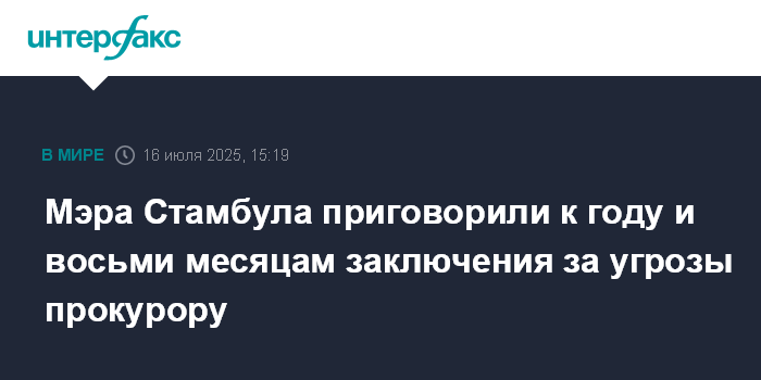 Москва. 16 июля. INTERFAX.RU - Отстраненный от должности мэр Стамбула Экрем Имамоглу получил год и восемь месяцев лишения свободы за угрозы и оскорбления в адрес прокурора, сообщает в среду агентство Bloomberg.