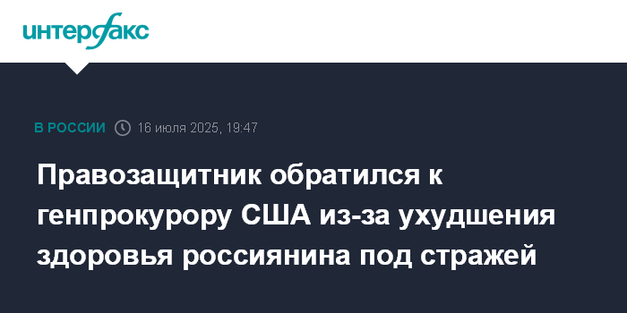 Правозащитник обратился к генпрокурору США из-за ухудшения здоровья россиянина под стражей