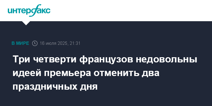 Москва. 16 июля. INTERFAX.RU - Большинство граждан Франции негативно относятся к предложению премьера страны Франсуа Байру отменить два праздничных дня, свидетельствует опрос телеканала BFM TV.