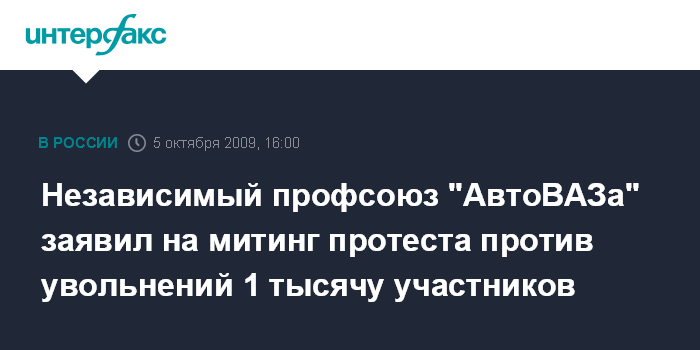 Москва. 5 октября. INTERFAX.RU - Независимый профсоюз ОАО "АвтоВАЗ" в понедельник подал заявку на проведение 17 октября в Тольятти митинга протеста против увольнений на предприятии.