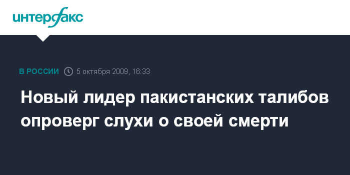 Москва. 5 октября. INTERFAX.RU - Лидер пакистанского движения "Талибан" Хакимулла Мехсуд встретился с доверенными журналистами и опроверг слухи о своей гибели, сообщает британская телерадиокорпорация Би-би-си в понедельник. Как отмечается в сообщении, это второе публичное заявление Х.Мехсуда после смерти предыдущего лидера талибов Бейтуллы Мехсуда в августе.