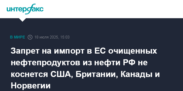 Запрет на импорт в ЕС очищенных нефтепродуктов из нефти РФ не коснется США, Британии, Канады и Норвегии