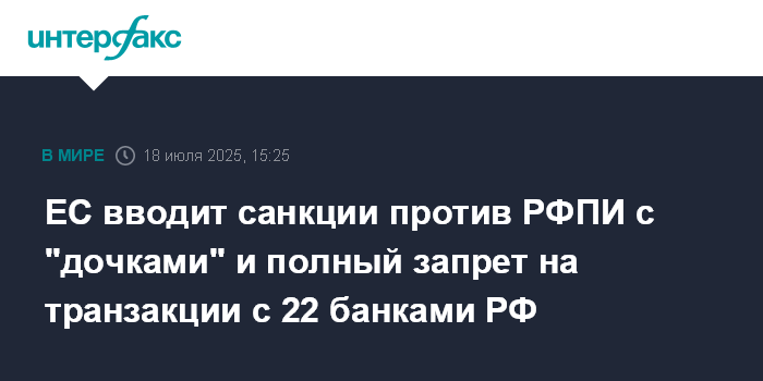 ЕС вводит санкции против РФПИ с "дочками" и полный запрет на транзакции с 22 банками РФ