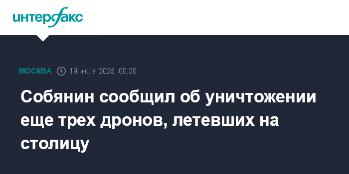 Москва. 19 июля. INTERFAX.RU - Средствами ПВО уничтожено еще три беспилотника, летевших на Москву, сообщил столичный мэр Сергей Собянин.