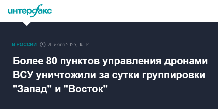 Москва. 20 июля. INTERFAX.RU - Группировки войск "Запад" и "Восток" сообщили об уничтожении 81 пункта управления беспилотной авиацией вооруженных сил Украины за минувшие сутки в зоне спецоперации.