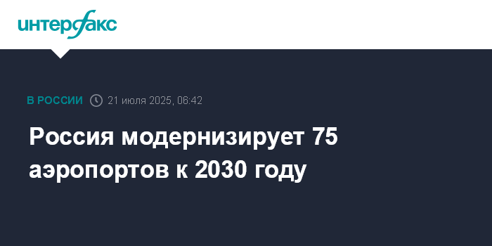 Москва. 21 июля. INTERFAX.RU - Россия планирует модернизировать не меньше 75 аэропортов к 2030 году, сообщил премьер-министр РФ Михаил Мишустин во время осмотра строящегося терминала международного аэропорта в Благовещенске.