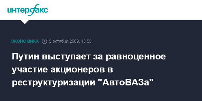 Москва. 5 октября. INTERFAX.RU - Премьер-министр РФ Владимир Путин выразил пожелание, чтобы все акционеры "АвтоВАЗа" приняли участие в реструктуризации завода.