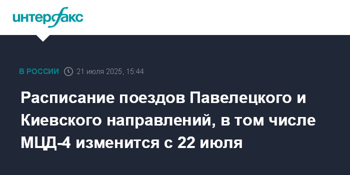 Москва. 21 июля. INTERFAX.RU - График движения ряда пригородных поездов Павелецкого и Киевского направлений, в том числе четвертой линии Московских центральных диаметров (МЦД-4, D4), поменяется в связи с модернизацией инфраструктуры, сообщили в Московской железной дороге (МЖД).