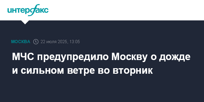 Москва. 22 июля. INTERFAX.RU - В Москве во вторник синоптики ожидают дождь, возможно грозы и усиление ветра со скоростью при порывах до 15 метров в секунду, сообщил столичный главк МЧС со ссылкой на прогноз.