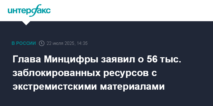 Москва. 22 июля. INTERFAX.RU - Роскомнадзор заблокировал доступ к 56 тыс. ресурсов с экстремистскими материалами, которые внесены в соответствующий реестр Минюста РФ; в адрес зарубежных платформ направлено 20 тыс. запросов об удалении, которые не исполняются, сообщил министр цифрового развития, связи и массовых коммуникаций Максут Шадаев.