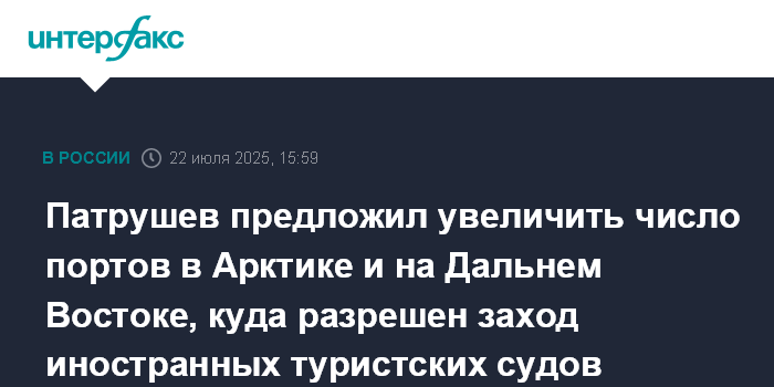 Москва. 22 июля. INTERFAX.RU - Количество российских портов в Арктике и на Дальнем Востоке, в которые разрешен заход иностранных туристских судов, необходимо увеличить, заявил помощник президента РФ, председатель Морской коллегии Николай Патрушев.