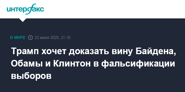 Москва. 22 июля. INTERFAX.RU - Президент США Дональд Трамп раскритиковал своего предшественника Джо Байдена и его администрацию, бывшего президента США Барака Обаму и конкурировавшую с ним на выборах в 2016 году Хилари Клинтон, заявив, что проведет расследование в отношении якобы их незаконной деятельности.