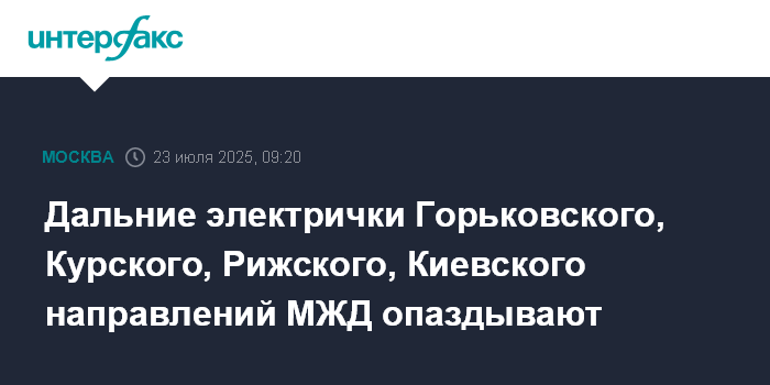 Москва. 23 июля. INTERFAX.RU - Пригородные поезда дальних маршрутов Горьковского, Курского, Рижского, Киевского направлений задерживаются по техническим причинам, интервал движения на второй и четвертой линиях Московских центральных диаметров (МЦД-2, МЦД-4) выдерживается, сообщили "Интерфаксу" в Московской железной дороге (МЖД).