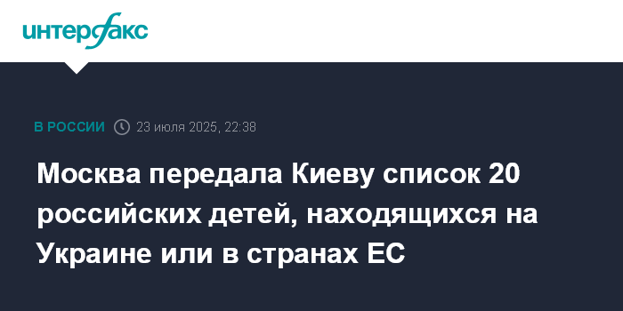 Он добавил: "И мы не просто поставили этот вопрос, а передали украинской стороне список детей, находящихся соответственно на Украине и в странах Европейского союза, это около 20 человек. Список детей и их законных представителей, с которыми можно связаться для того, чтобы обеспечить возвращение этих детей в Россию".