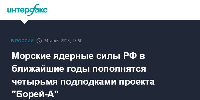 Москва. 24 июля. INTERFAX.RU - В ближайшие годы морские ядерные силы России в плановом порядке пополнятся еще четырьмя подводными лодками проекта "Борей-А", две из них уже находятся на стадии строительства, сообщил президент РФ Владимир Путин.